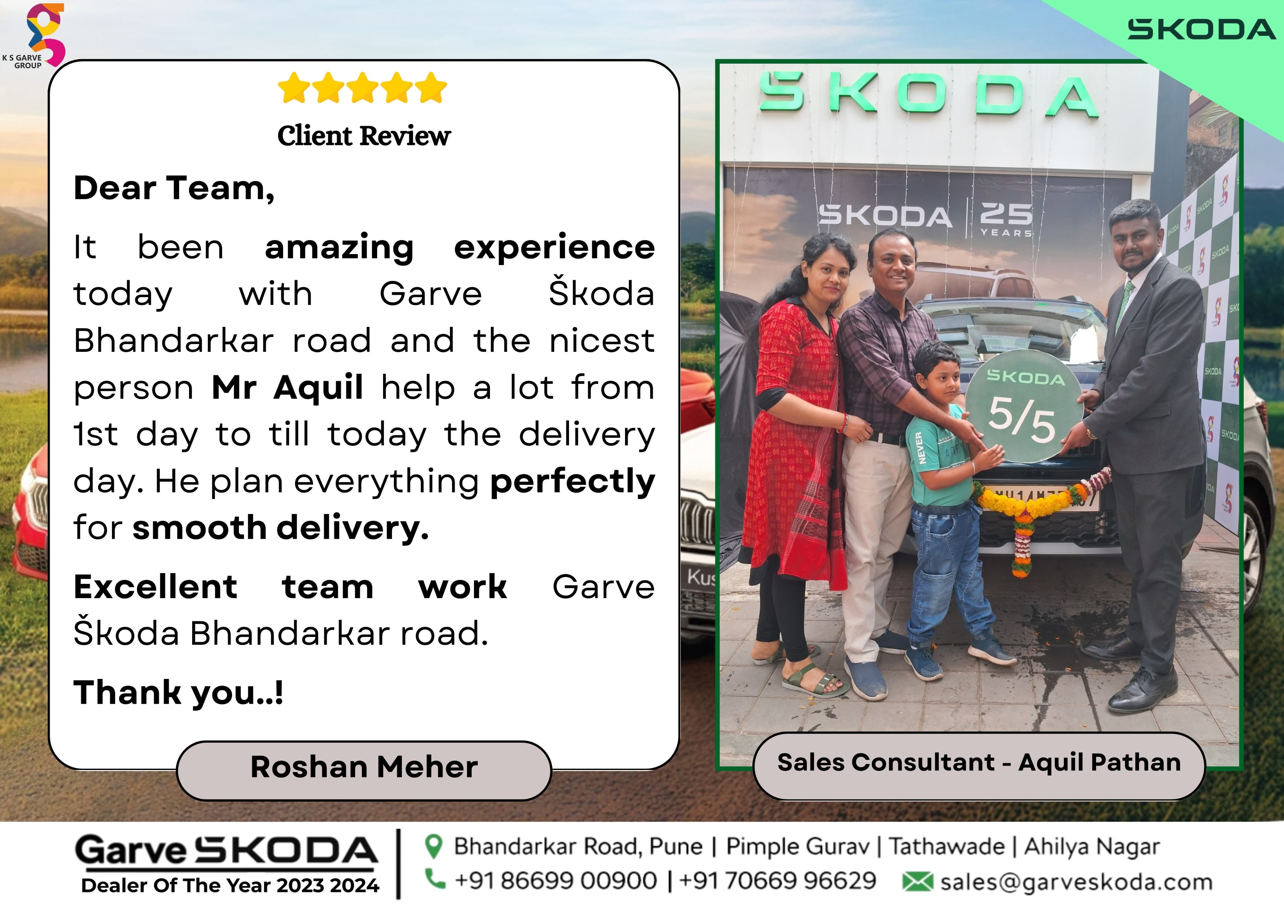 It has been an amazing experience today with Garve Škoda Bhandarkar Road and the nicest person, Mr. Aquil, who helped a lot from the first day till the delivery day. He planned everything perfectly for a smooth delivery.