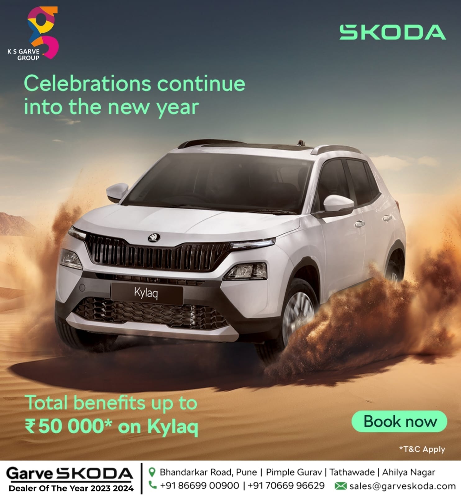 “Celebrate the new year with Škoda Kylaq and enjoy total benefits up to ₹50, 000 at Garve Škoda.”
